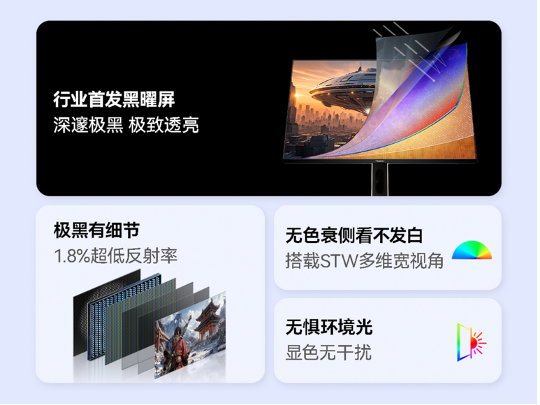 沉浸式的影游体验,不应为环境光所妥协。与海信万元级旗舰电视同源的黑曜屏,让海信显示器GX能够适配多种光线环境与观看视角,内外双层纳米级LR低反膜加持,屏幕反射率低至1.8%,告别传统显示器的朦胧感,纯黑场景不发灰,画面通透有质感,强光环境下依然可以清晰还原游戏场景中的纹理细节与丰富的画面层次。